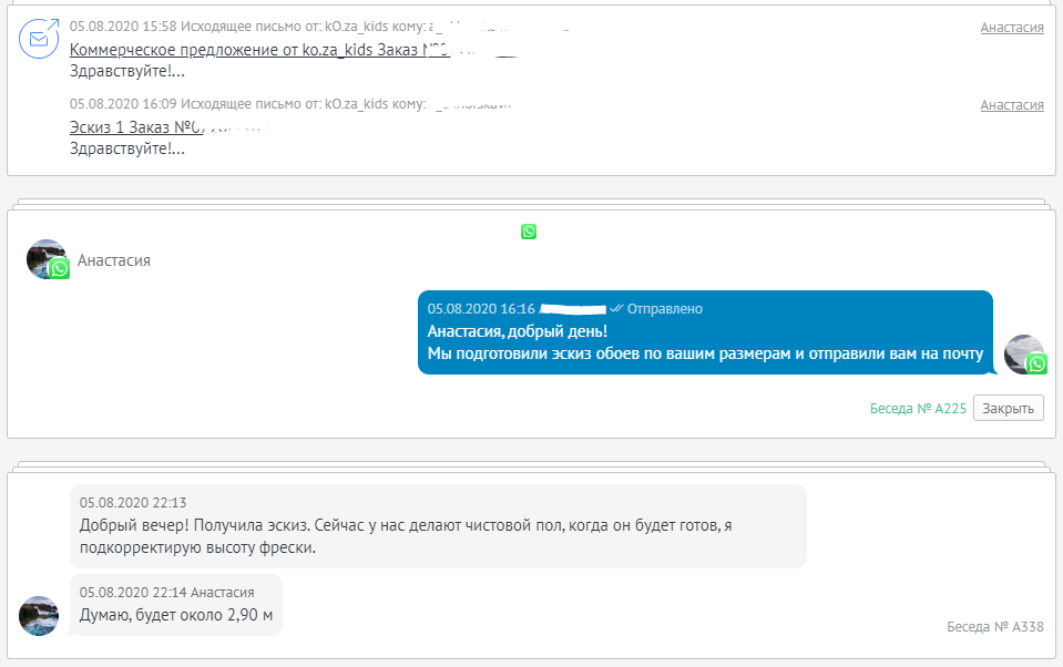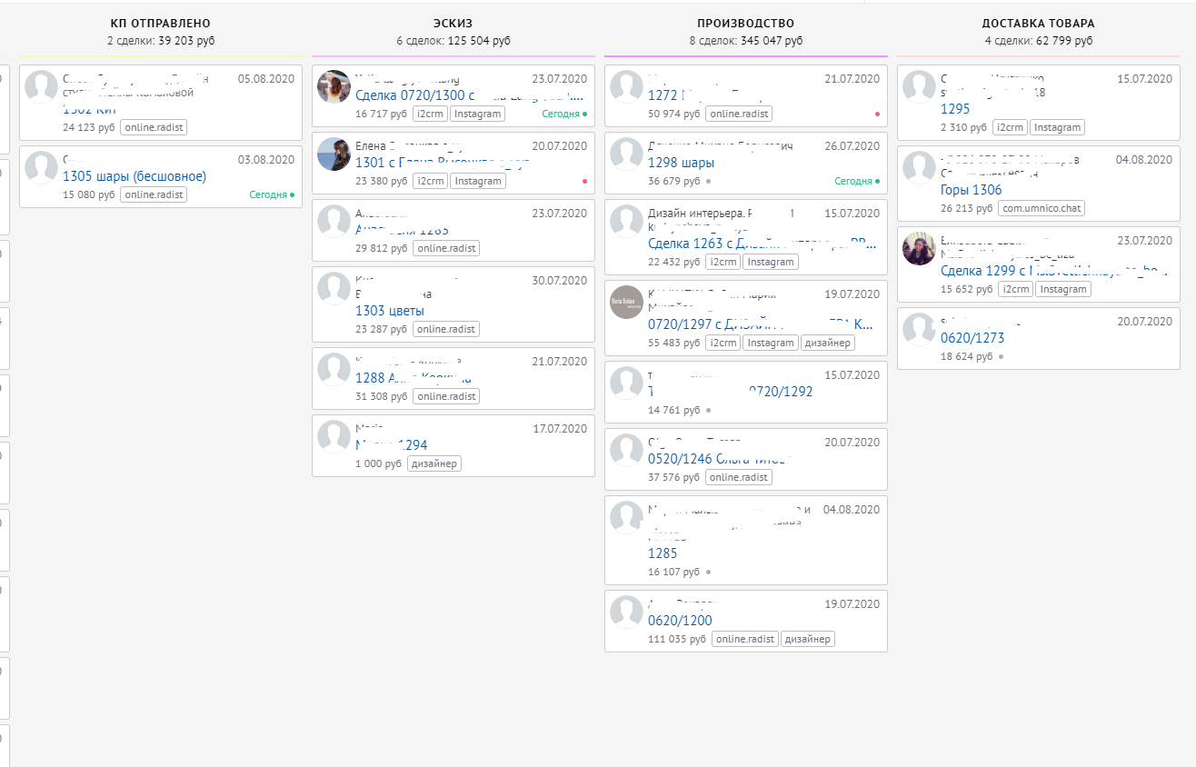 Когда с Instagram или WhatsApp "приходит" новая заявка в цифровой воронке появляется этап "Оставлена заявка". На этом этапе ведется следующая работа: переписка, выяснение размеров и потребностей. Если клиент определился с выбором,то ему отправляют коммерческое предложение на почту и сделка переходит в статус "КП отправлено". После внесения оплаты сделка перемещается на изготовление эскиза в статус "Эскиз". Далее, менеджер передает эскиз в "Производство". Все данные с момента первого обращения отображаются в карточке сделки. После отправки товара сделка переходит на этап "Доставка товара" и переводится в успешно завершенные