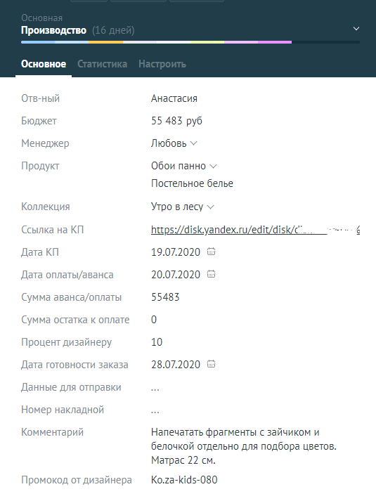 В каждой сделке имеются поля с данными о заказе: ссылка на КП, коллекция, даты оплаты и т.д. Эти данные хранятся на сделке, поэтому вся важная информация находится перед глазами, а так же это позволяет собирать аналитику и статистику по всем заказам. Например какую коллекцию чаще заказывают.